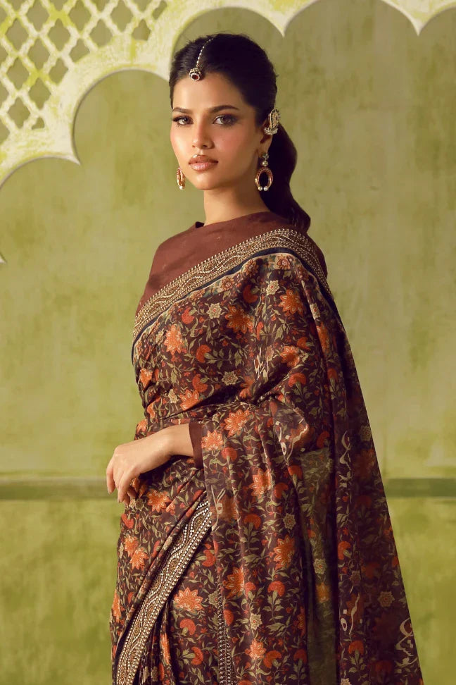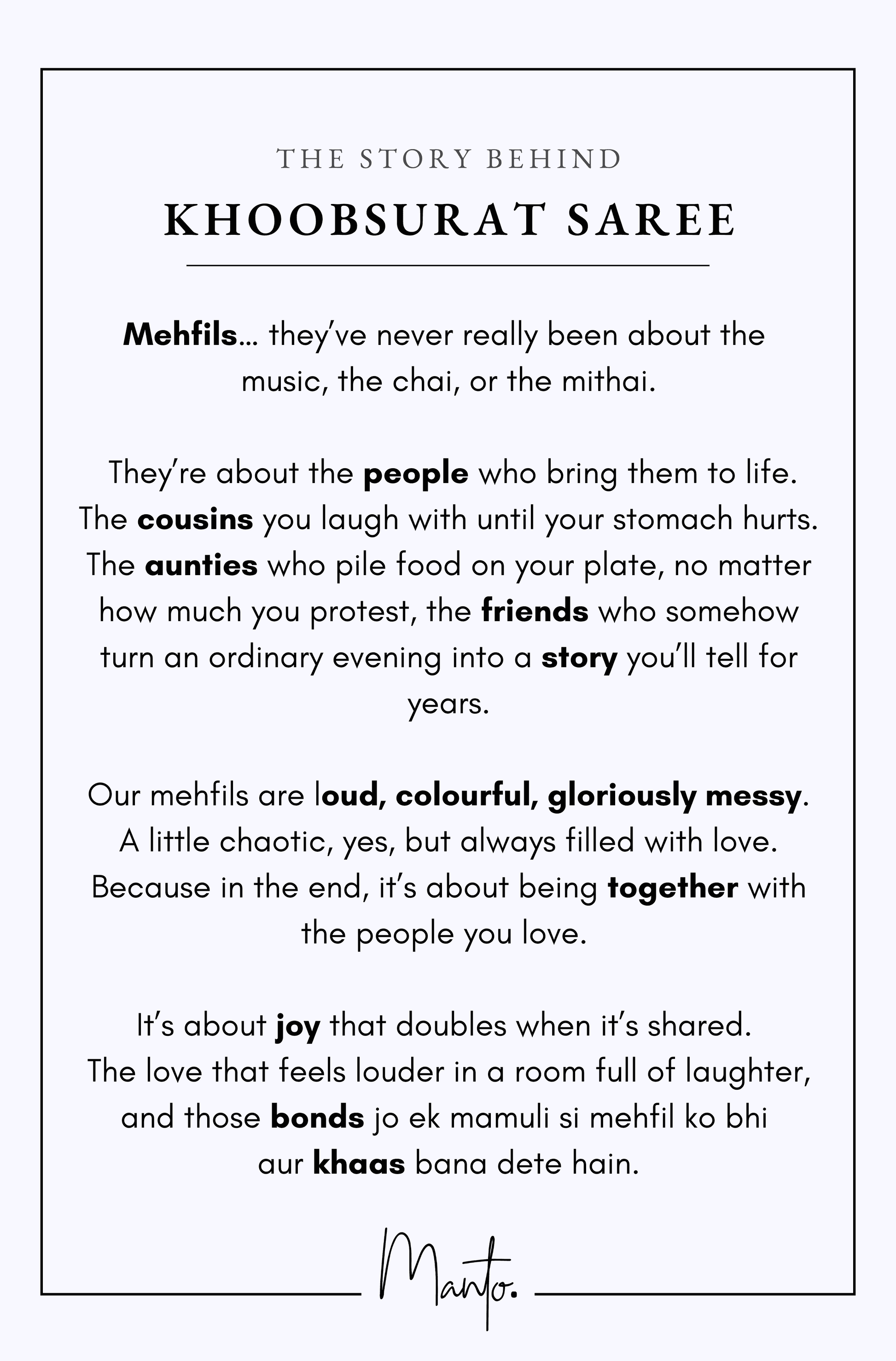 Khoobsurat is a cotton silk ready-to-wear saree with a Banarsi blouse and an embroidered border, featuring Urdu words calligraphed throughout.